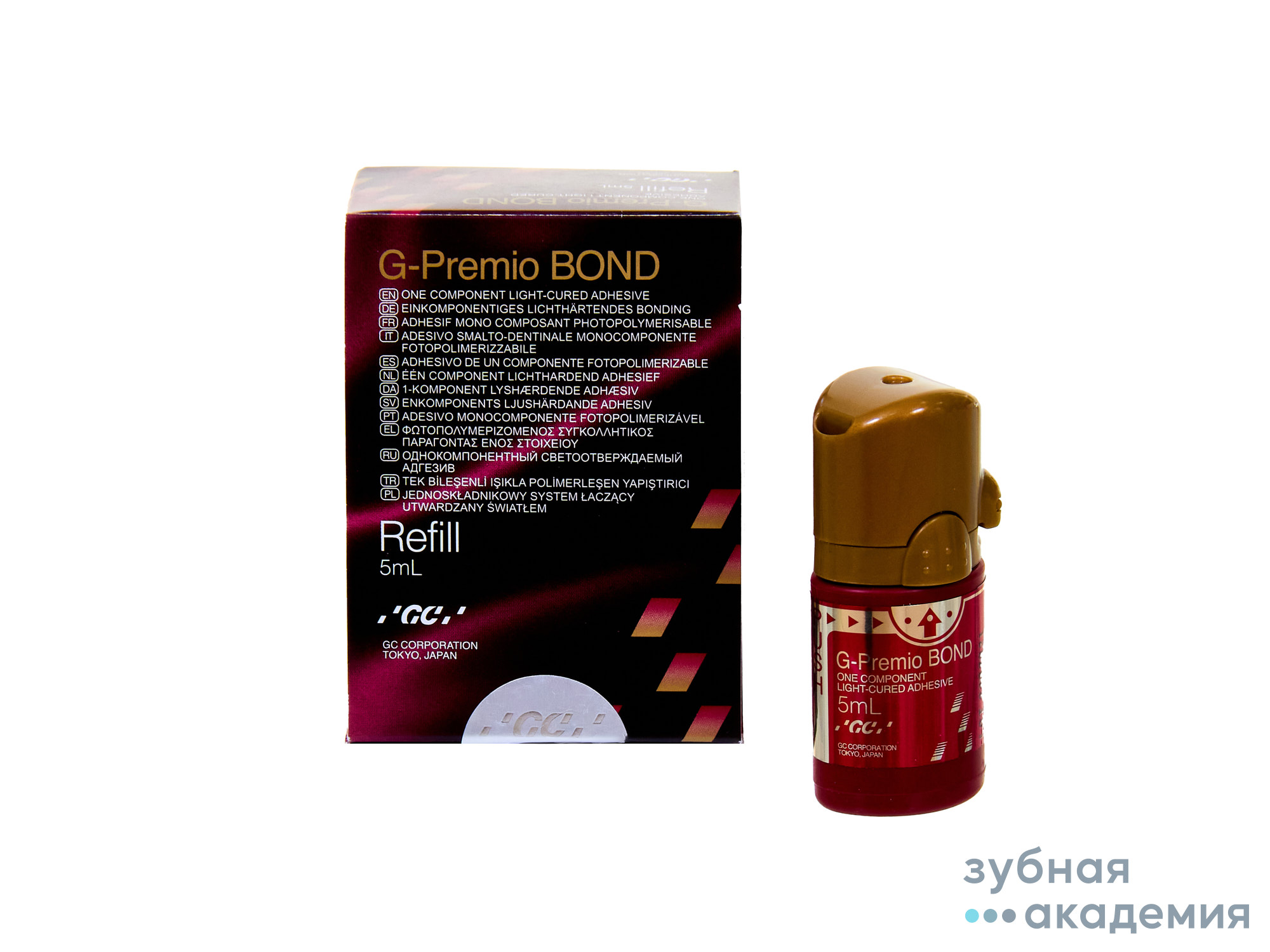 - Джи премиум бонд (G-Premio Bond)– современный адгезив однокомпонентного светоотверждаемого типа. Это материал восьмого поколения, который схватывается под световым потоком за 10 с. Материал G-Premio Bond применяется при прямых реставрациях композитными материалами. Может использоваться на гиперчувствительных поверхностях и в сочетании с металлическими конструкциями.