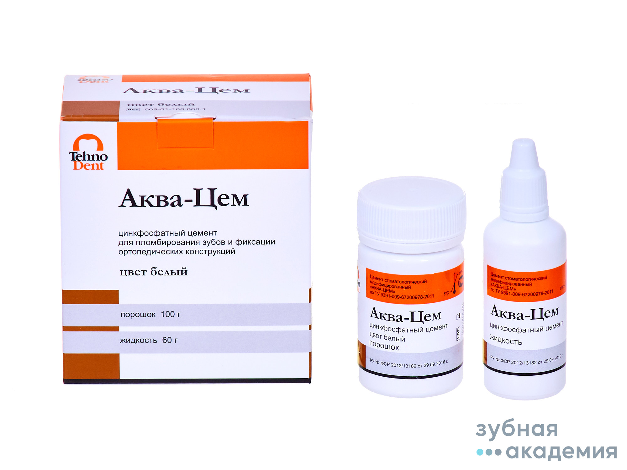 - Цинкфосфатный цемент (белый) на основе окиси цинка, фосфатов алюминия и цинка, ортофосфорной кислоты. Цемент выпускается трёхцветный: белый, светло-желтый, золотисто-жёлтый. ПОКАЗАНИЯ К ПРИМЕНЕНИЮ: • Фиксация одиночных коронок и мостовидных протезов • Пломбирование молочных зубов • Пломбирование зубов, подлежащих закрытию коронками • Изолирующая прокладка под пломбировочные материалы • Фиксация штифтов Цемент образуется при смешивании порошка, содержащего модифицированные окиси цинка и магния, с жидкостью, представляющей собой раствор ортофосфорной кислоты, содержащий фосфаты цинка и алюминия. Добавка фторида кальция снижает риск возникновения вторичного кариеса, ингибируя брожение и разложение глюкозы до молочной кислоты. При смешивании порошка с жидкостью в весовом соотношении 2:1 получается пластичная масса, образующая цементный камень с прочностью при сжатии 105 МПа, что превышает показатель прочности по ГОСТ 31578 на 50 %. Состав упаковки: пластиковая банка 100 г. + флакон-капельница 60 г. + мерная ложка