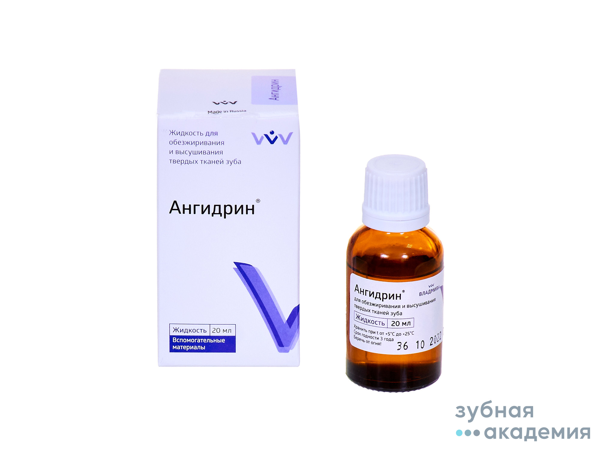 Жидкость «Ангидрин» предназначена для обезжиривания и высушива-ния твердых тканей зуба перед пломбированием или перед установкой несъем-ных протезов, а также для очистки протезных поверхностей перед фиксацией.