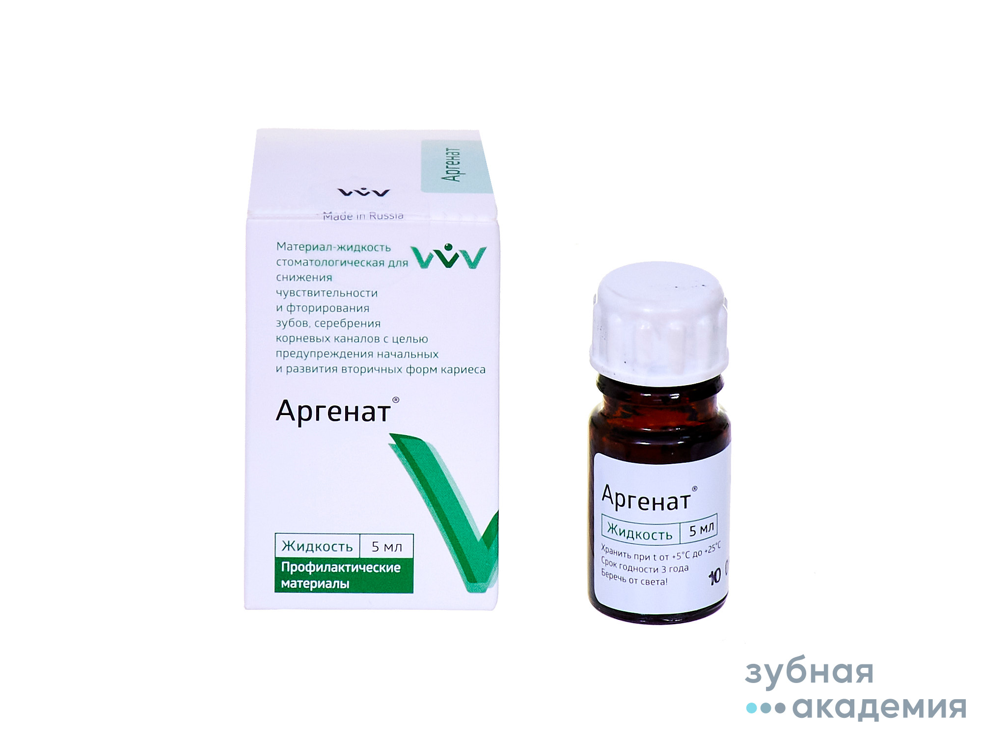 - НАЗНАЧЕНИЕ «Аргенат» однокомпонентный - предназначен для фторирования и снижения чувствительности зубов (кроме фронтальных), предотвращения развития вторичного кариеса, а также для серебрения корневых каналов зубов при начальных формах развития кариозных процессов (особенно кариеса молочных зубов). СОСТАВ И ОСНОВНЫЕ СВОЙСТВА «Аргенат» однокомпонентный выпускается в виде бесцветной прозрачной жидкости, содержащей комплексную соль фторид диамминсеребра (I). Действие материала основано на преобразовании ионов кальция и ортофосфат-ионов гидроксиапатита зуба во фторид кальция и ортофосфат серебра, которые коагулируют протеины органической составляющей дентина, блокируя проникающие полости твердых тканей зуба, что приводит к укреплению структуры дентина. Клиническая эффективность однокомпонентного «Аргената» в несколько раз выше, чем у препаратов на основе нитрата серебра.