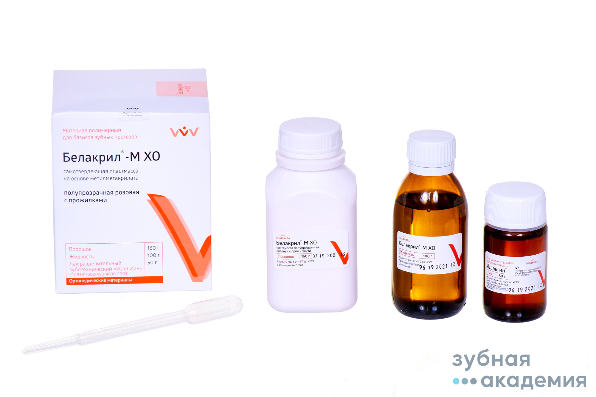 - НАЗНАЧЕНИЕ ХО - базисный материал самотвердеющий, предназначенных для починок и перебазирования съёмных зубных протезов, а также для изготовления и ремонта ортодонтических и ортопедических аппаратов и конструкций. СОСТАВ И ОСНОВНЫЕ СВОЙСТВА Базисные материалы «Белакрил» выпускаются в виде двух компонентов - порошка, содержащего полиэфиры метакриловой кислоты, катализатор реакции полимеризации перекись бензоила, и жидкости, содержащей мономер метилметакрилат (М) и/или мономер этилметакрилат (Э), после смешивания порошка с жидкостью образуется полимер, твердеющий при нагревании (горячего отверждения) - ГО или без нагревания (самотвердеющий) - ХО. Базисные материалы «Белакрил» отличает высокая технологичность, простота и быстрота изготовления изделий, имеющих высокое качество, функциональную долговечность, натуральный внешний вид и биосовместимость.