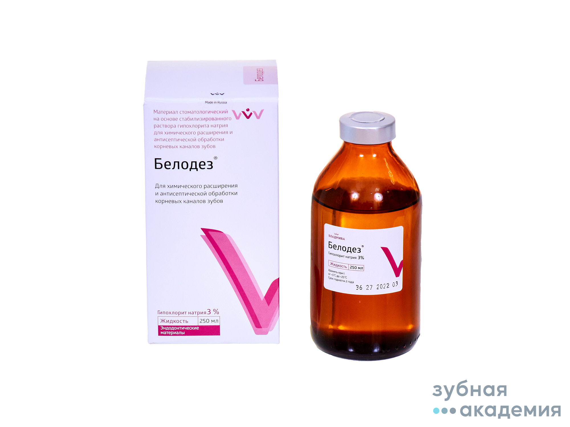 «Белодез» представляет собой стабилизированный раствор гипохлорита натрия, растворяет органическую основу дентина: как живые (химически фиксированные), так и некротизированные ткани. «Белодез» обладает бактерицидным действием на все грамположительные и грамотрицательные микроорганизмы, грибы и вирусы без цитотоксичности на уровне апекса. При обработке гипохлоритом натрия водород аминогрупп (-HN-) в молекулах белков замещается хлором (-ClN-), образуя хлорамин, который играет важную роль в антимикробной активности. Бактерицидное действие предлагаемых препаратов также обусловлено щелочными свойствами (рН 10,0-12,0).