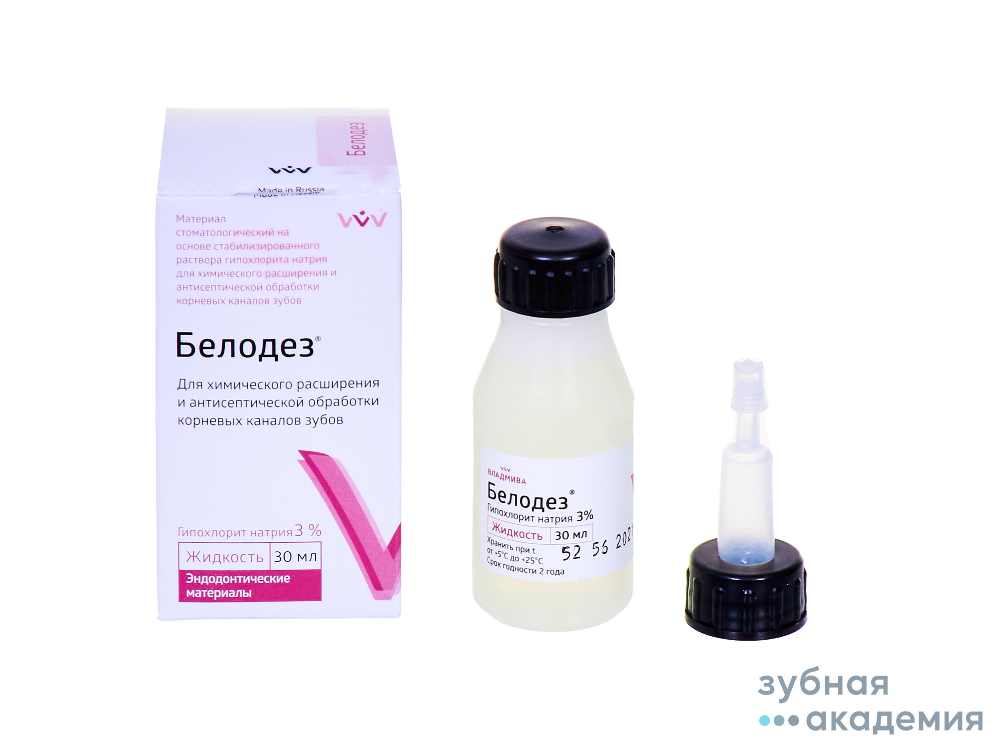 Стоматологический материал на основе стабилизированного раствора 3% гипохлорита натрия предназначен: для медикаментозной обработки корневых каналов в качестве бактерицидного, кровоостанавливающего и отбеливающего средства, для химического расширения каналов в сочетании с растворами ЭДТА, а также для дезинфекции полости зуба.