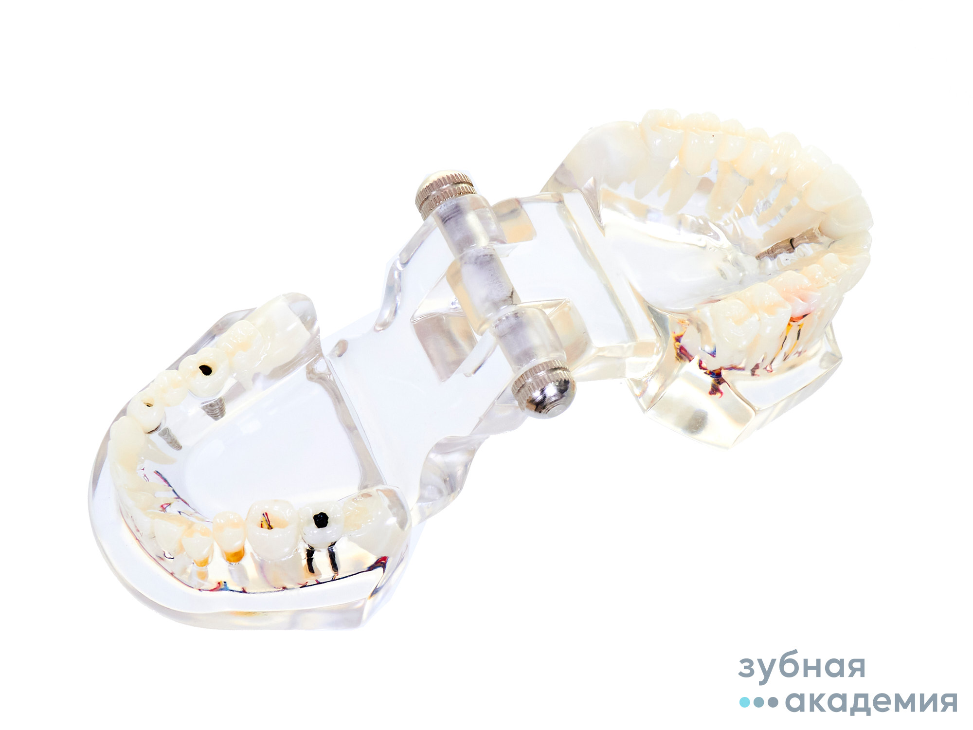 Макет представляет собой копию пораженных патологией зубных рядов верхней и нижней челюсти на пластиковом прозрачном основании, соединенных между собой. Удобная конструкция позволяет регулировать положение челюстей. Имитация имплантатов, пораженных патологическими процессами каналов и шеечно-корневой зоны.