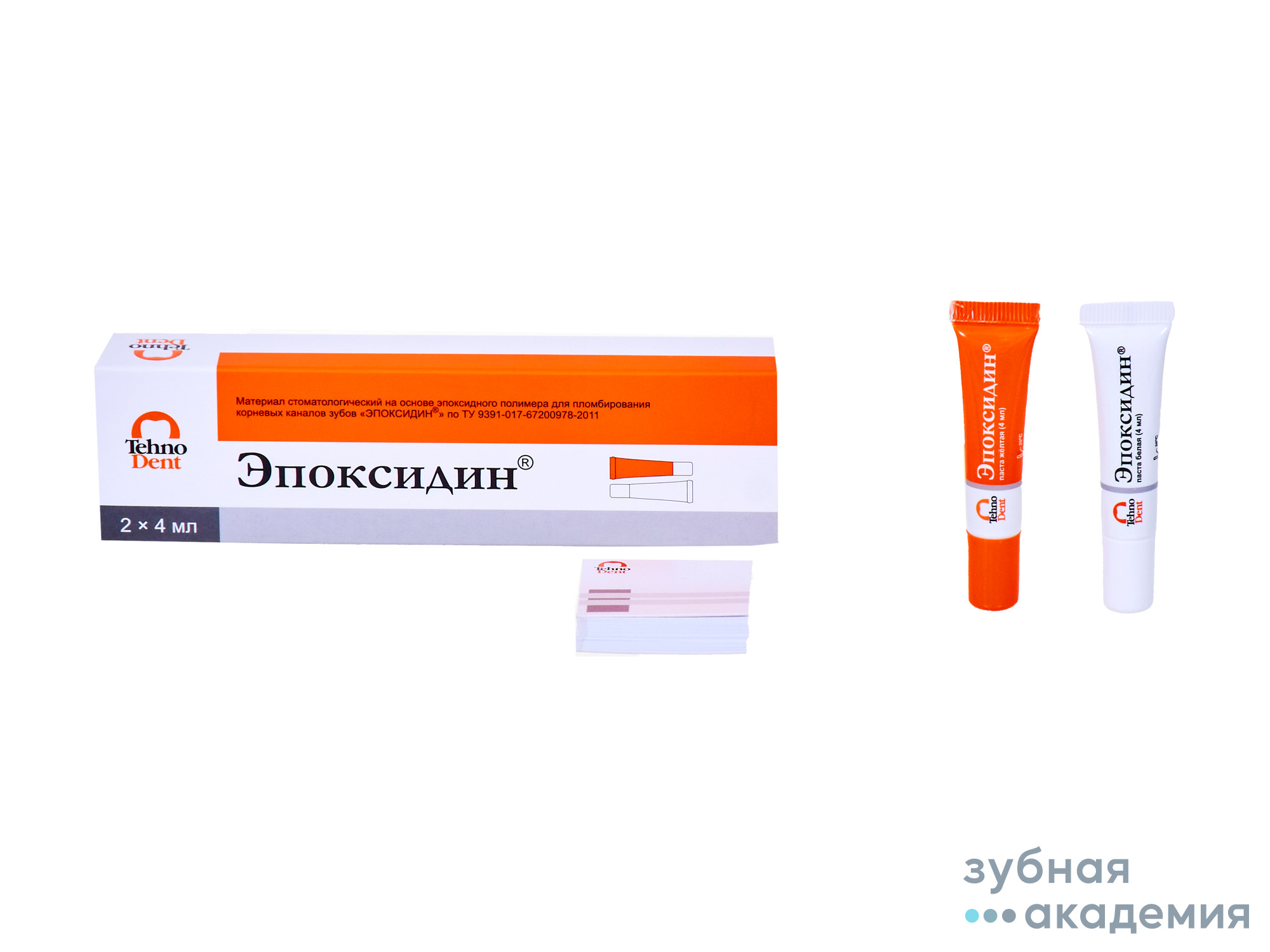 Материал стоматологический ЭПОКСИДИН выпускается в виде комплекта: паста белая и паста желтая. Материал содержит эпокси-смолу, амин-отвердитель, наполнитель, пластификатор и окись циркония в качестве рентгеноконтрастной добавки.