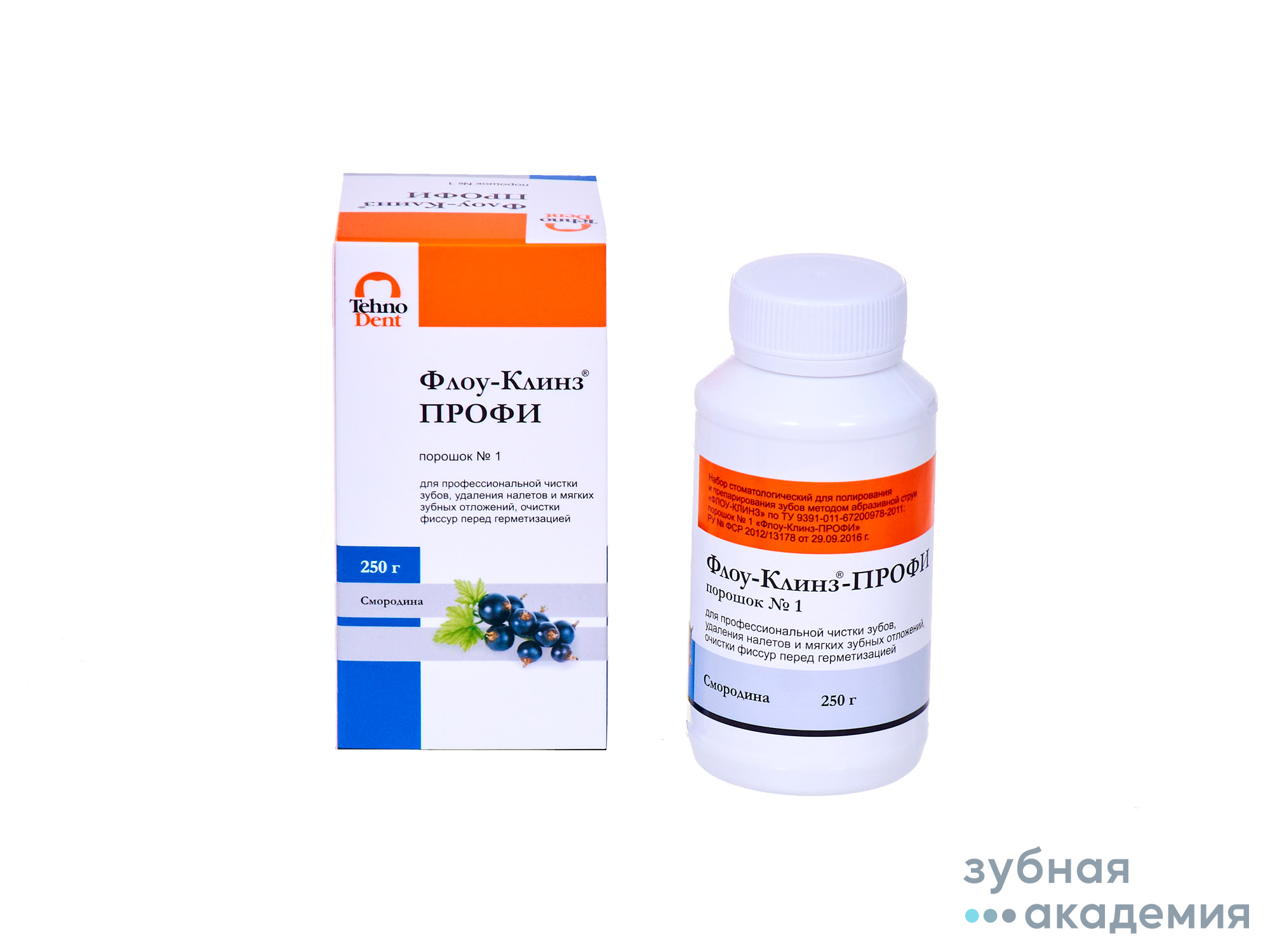 - Производитель: Технодент Порошок Флоу-Клинз-Профи содержит карбонат кальция (50-70 мкм) и бикарбонат натрия (50-60 мкм) Показания к применению: профилактическая очистка эмали зубов методом пескоструйной обработки. Преимущества: - Щадящее удаление налета, мягких зубных отложений, удаление пигментаций и отбеливание зубов; - Качественная очистка фиссур перед герметизацией; - Надежное удаление пигментаций и отбеливание зубов; - Не приводит к гиперестезии зубов; - Не забивает наконечник во всех аппаратах пескоструйного типа. Вкусы: - вишня; - мультифрукт; - мята; - нейтральный; - смородина - цитрус. Форма выпуска: пластиковая банка 250 гр.