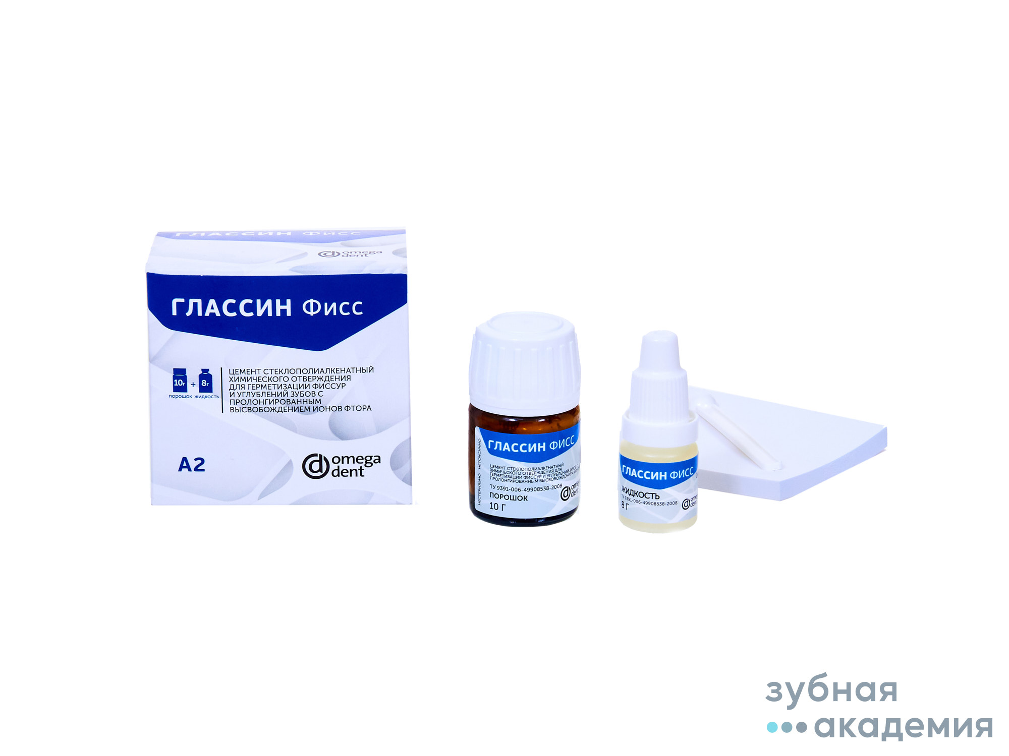 - Показания к применению: "ГЛАССИН Фисс" – стеклополиалкенатный (стеклоиономерный) материал, предназначенный для закрытия углублений и фиссур жевательных зубов, пломбирования некариозных поражений, протекающих без размягчения тканей, изолирования поверхности при наличии сильно обнаженной шейки зуба. Также используется в качестве подкладки под пломбы всех видов. Порошок представлен в виде мелкодисперсного алюминий-кальций латан фторкремниевого стекла с рентгеноконтрастными добавками. В качестве жидкой части препарата выступает водный раствор полиакриловой кислоты определенной молекулярной массы с улучшающими ее свойства органическими присадками. В системе "жидкость + порошок" все дисперсные частицы образованной при смешении структуры имеют прочные связи, что предотвращает их вымывание из цемента. "ГЛАССИН Фисс" обладает высокой химической адгезией к эмали и дентину и характеризуется прекрасной биологической совместимостью с твердыми тканями зуба.
