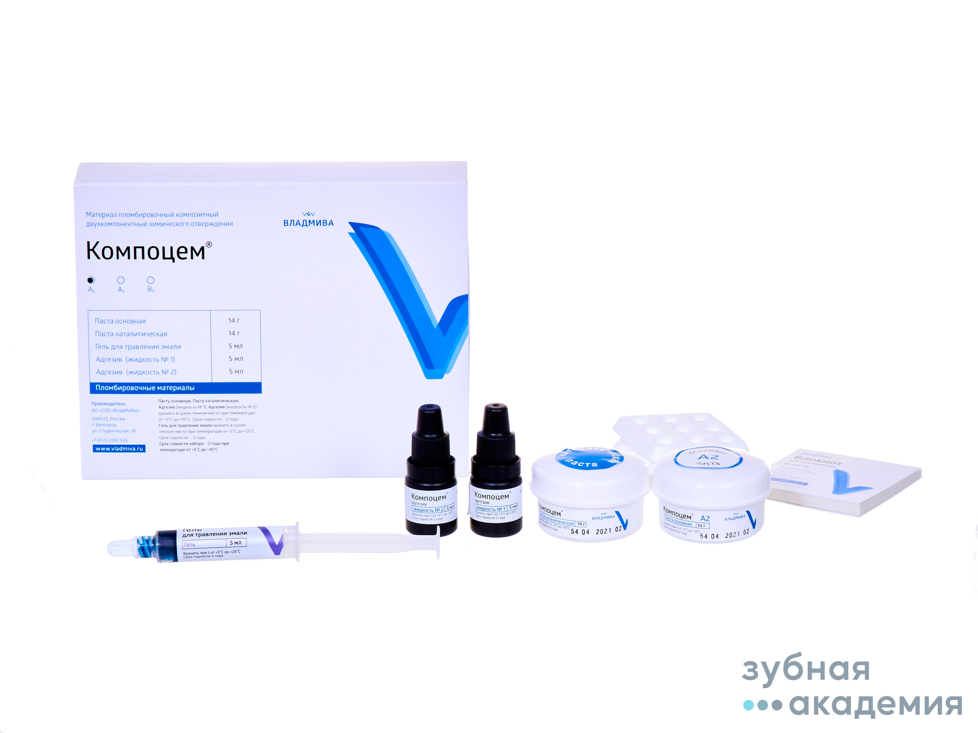 - ОПИСАНИЕ: КОМПОЦЕМ-ХИМИЧЕСКИЙ КОМПОЗИТ ПАСТА-ПАСТА /A2 ПАСТА ОСНОВНАЯ 14Г.+ПАСТА КАТАЛИТИЧ.14Г.+ГЕЛЬ ДЛЯ ТР.ЭМАЛИ 5МЛ.+АДГЕЗИВ №1 5МЛ.+АДГЕЗИВ №2 5МЛ./ВЛАДМИВА Материал «Компоцем» выпускается комплектом порошок-жидкость или паста-паста. «Компоцем» (порошок-жидкость) - двухкомпонентный композиционный материал. Порошок представляет собой тонкодисперсный силанизированный кварц, окрашенный пигментами и содержащий инициатор отверждения; жидкость содержит бисфенолглицидилметакрилат, триэтиленгликольдиметакрилат, активатор полимеризации. Композиционный материал «Компоцем» обладает рядом специфических свойств, которые выгодно отличают его от других пломбировочных цементов: высокая механическая прочность; стабильность и низкая растворимость в ротовой жидкости; минимальная усадка при твердении; идентичность с тканями зуба (цвет, стойкость к истиранию).