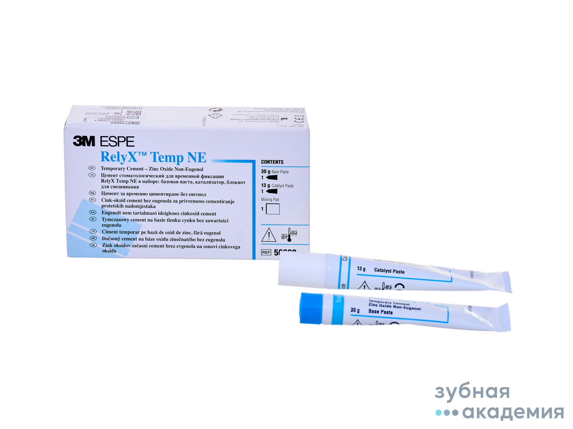 - 3M-Relyx Temp NE 56660 (базовая паста 30 г+ катализатор 13 г, блокнот для замешивания)- временый цемент без эвгенола! Безэвгенольный цемент на основе оксида цинка. RelyX® Temp NE идеален для использования совместно с высокоточными реставрациями, начиная от временных материалов, таких как Protemp® 4. Назначение - Временные фиксации временных и постоянных коронок и мостов. Преимущества продукта - Не содержит эвгенола: не ингибирует затвердевание композитных реставрационных материалов и может применяться универсально, независимо от типа постоянного цемента - Оптимальное краевое прилегание за счет малой толщины слоя - Высокая степень адгезии к тканям зуба в сочетании с легкостью снятия временной конструкции - Экономия времени благодаря легкости удаления излишков цемента при фиксации.
