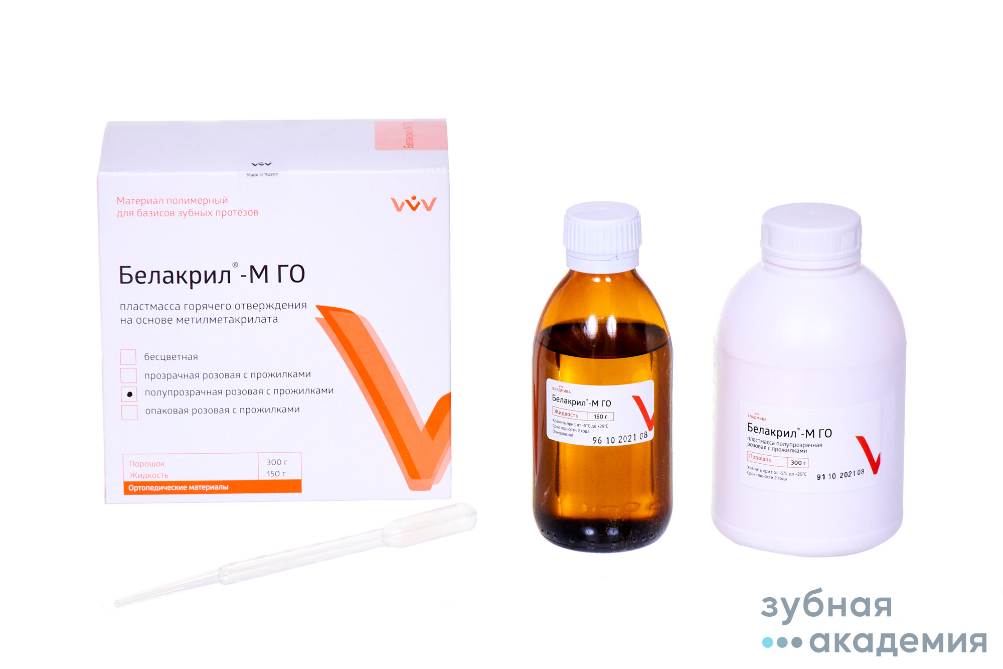 Базисные материалы «Белакрил» выпускаются в виде двух компонентов - порошка, содержащего полиэфиры метакриловой кислоты, катализатор реакции полимеризации перекись бензоила, и жидкости, содержащей мономер метилметакрилат (М) и/или мономер этилметакрилат (Э), после смешивания порошка с жидкостью образуется полимер, твердеющий при нагревании (горячего отверждения) - ГО или без нагревания (самотвердеющий) - ХО. Базисные материалы «Белакрил» отличает высокая технологичность, простота и быстрота изготовления изделий, имеющих высокое качество, функциональную долговечность, натуральный внешний вид и биосовместимость.
