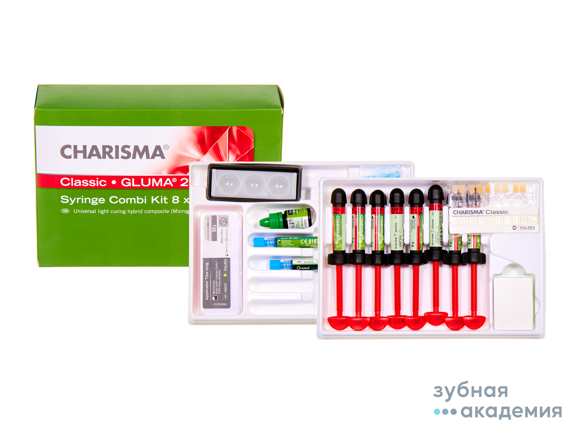 Набор 6 шприцев (2 шприца по 4г каждого оттенка A2; A3 + 1 шприц по 4г каждого оттенка A1; A3.5) + 4 мл адгезив Gluma 2Bond + 2 шприца по 2.5мл GLUMA Etch 35 Gel + пиктограммы. Состав:Матрица: основа Bis–GMA. Наполненность 61% Наполнитель Microglass® (Microglass II®). Барий алюмофтористое стекло и преполимеризованный наполнитель без содержания диоксида кремния. Диапазон дисперсности частиц наполнителя: ∅ 0,005 – 10µm. Рентгеноконтрастность 253 % Al. Показания к применению: прямые реставрации зубов при дефектах I–V(VI) классов по Блеку. Изготовление прямых композитных виниров. Улучшение цвета и формы зубов. Починка керамических и металлокерамических коронок при сколах. Особенности Charisma Classic: Более высокая опаковость оттенков по сравнению с Charisma. Пластичная консистенция. Идеален для техники single–shade–layering (техника восстановления одним оттенком). Новый тип наполнителя позволяет воспроизводить «глубину цвета» без «белесых» зон.