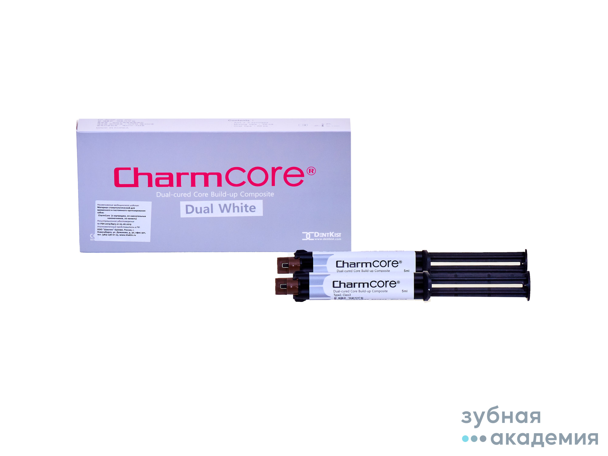 - CharmCore® - композит двойного отверждения. Показания к применению: - наращивание культи зуба, цементирование обширных полостей, цементирование корневых штифтов. CharmCore – материал полимерный восстановительный тип 2, класс 3по ISO 4049 - композитная смола двойного отверждения: самоотверждение (происходит под действием химических агентов) и отверждение под воздействием внешних источников энергии. CharmCore - нестерильный, состоит из двух компонентов: основы и катализатора. Компоненты в виде пасты заправлены в двойной шприц (картридж). В одном шприце картриджа – основа, в другом - катализатор. Компоненты материала, заправленные в картридж, для использования по показаниям предварительно механически смешивают путем надавливания на поршень двойного шприца. Компоненты материала CharmCore окрашены в контрастные цвета, что позволяет при смешивании определять момент достижения однородности смеси. Основа имеет оттенки: желтый (А3 - по шкале «Вита»), синий, белый. Катализатор - белый.