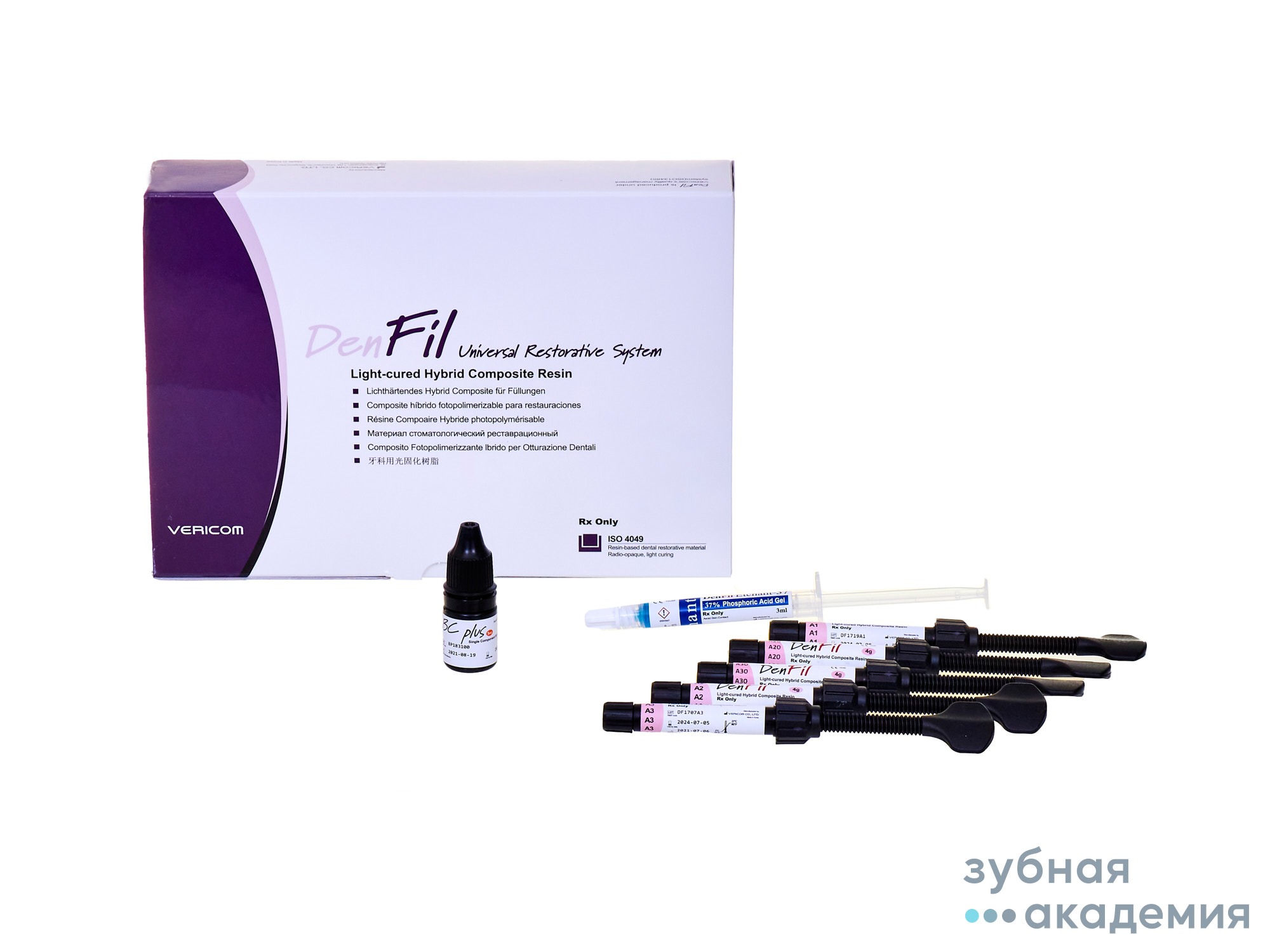 УПАКОВКА: 5 шпр х 4г. (A2, A3, A3,5, B2, B3), адгезив BC plus 5 мл, протравочный гель Denfil etchant, 5 мл., канюли 40 шт, кисточки 50 шт, шкала расцветок. гладилка пластмассовая, палетка для замешивания, полипанель для замешивания.