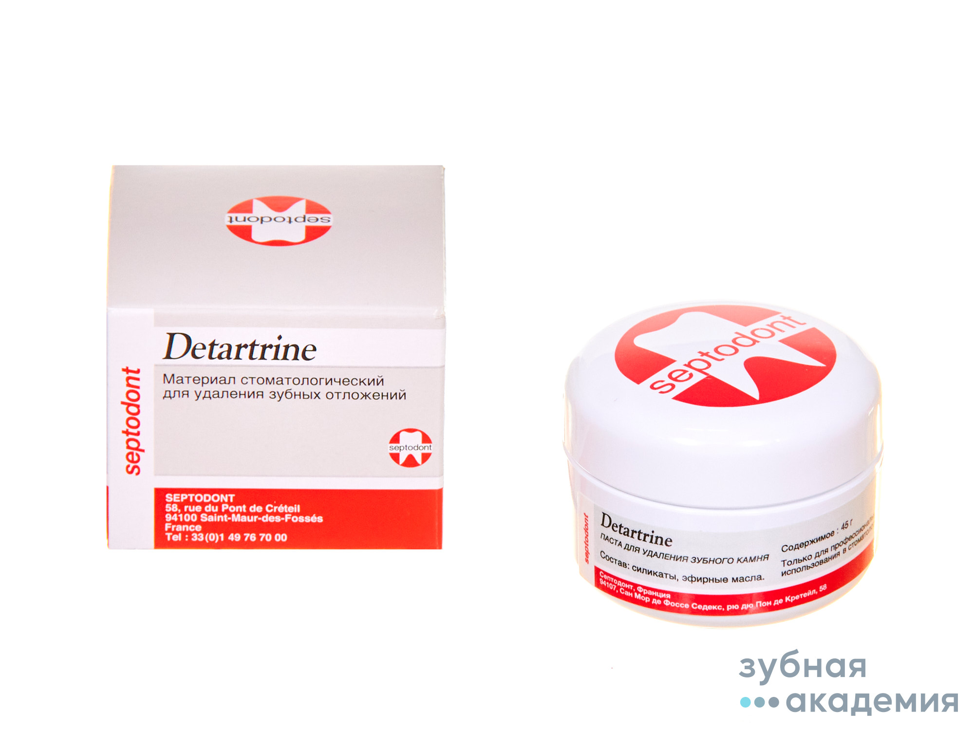 - Паста для удаления зубного камня. Показания: •Окончательная обработка зуба после скейлинга; •Удаление пигментированного зубного налета курильщика; •Окончательная полировка пломб. Свойства: Представляет собой пасту с приятным вкусом, обладает превосходными чистящими свойствами, позволяющими осуществить качественную полировку поверхности зуба после скейлинга, а также удалить мягкий зубной налет. Присутствующие в Detartrine масла обеспечивают прекрасный вкус и комфорт пациента. Способ применения: Взять необходимое количество пасты шпателем, нанести на циркулярную щетку, провести полировку поверхности. Противопоказания: Аллергическая реакция на параформальдегид.
