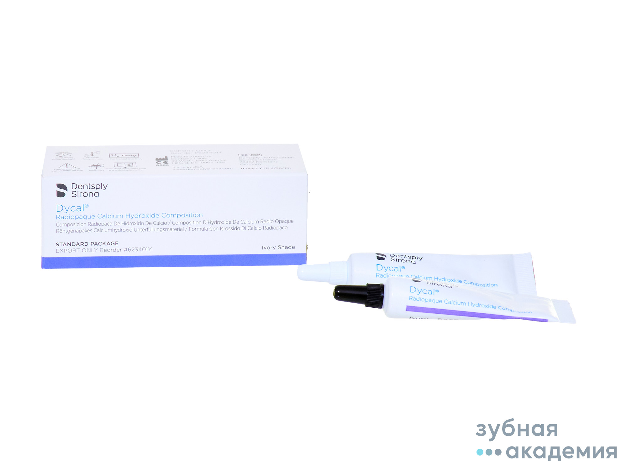 Dycal - лечебный прокладочный материал на основе гидроксида кальция. Прочный, самоотверждаемый, рентгеноконтрастный препарат гидроокиси кальция. Препятствует полимеризации реставраций из композитов или материалов на основе акриловых смол. Имеет улучшенные физические свойства, отличаясь более высокой прочностью на сжатие и низкой растворимостью. Материал показан для защиты пульпы, способствует образованию вторичного дентина для большей надежности лечения. Дайкал — стоматологический материал, применяется в качестве подкладочного слоя перед проведением реставраций зубных полостей с помощью композитов. Также используется для прямого и непрямого покрытия пульпы и служит надежной защитой, противостоящей проникновению бактерией. В состав материала входит гидроксид кальция, что обеспечивает достаточно высокую прочность пломбы и сопротивление к возникновению кариозного рецидива.