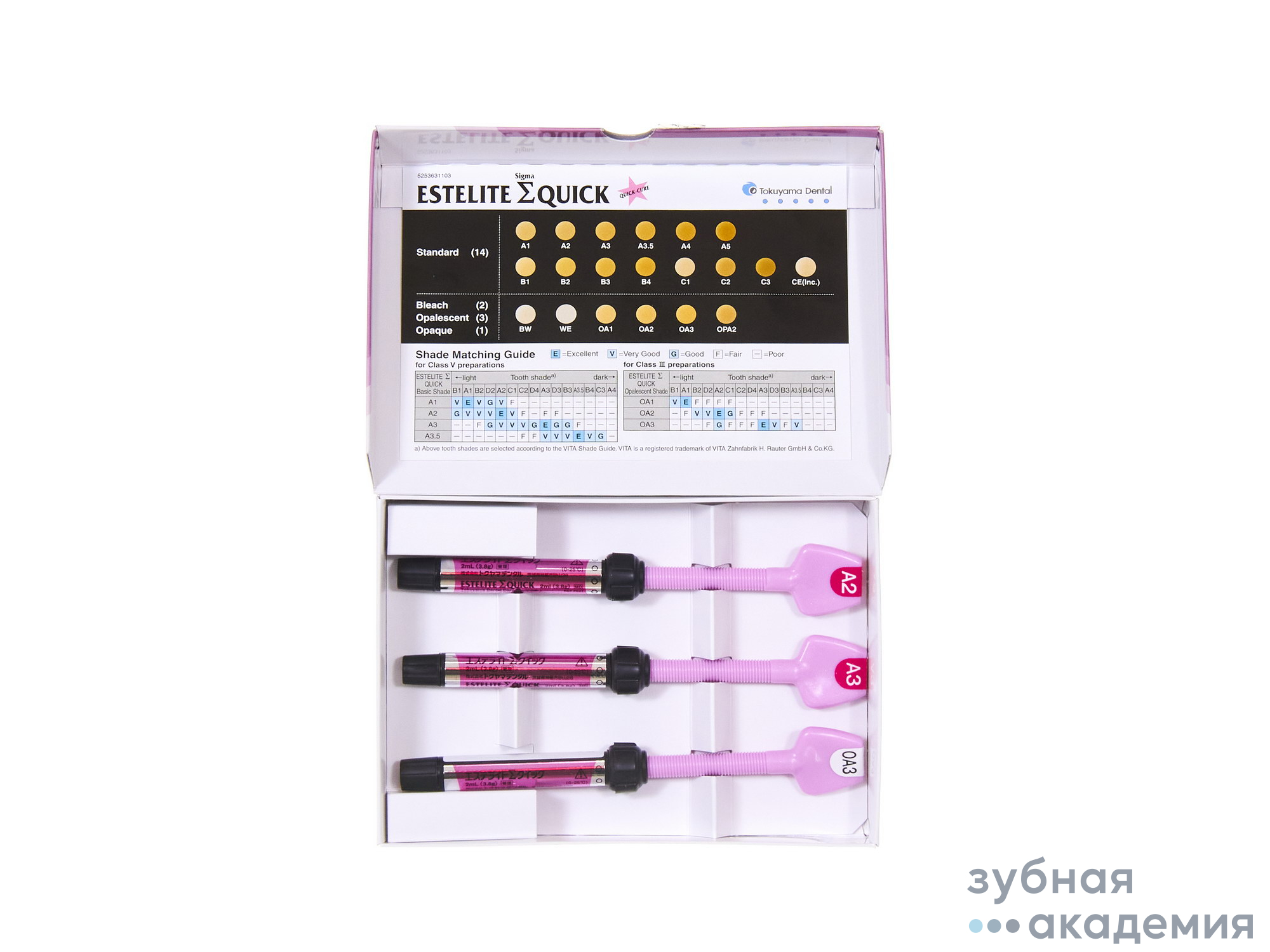 Состав набора: 3 шприца (3 х 3,8 грамма) с материалом Estelite Sigma Quick оттенков A2, A3, OA3 (по 1 шприцу каждого оттенка).