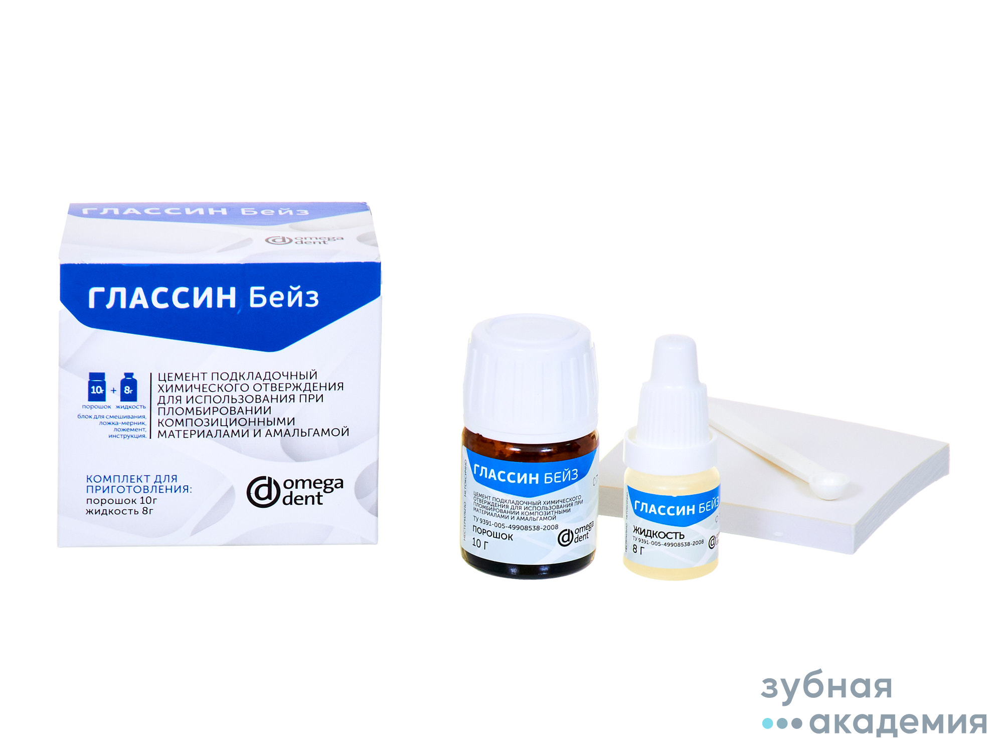 - Стеклоиономерный подкладочный цемент. Показания к применению: "ГЛАССИН Бейз" – это стеклополиалкенатный (стеклоиономерный) рентгеноконтрастный подкладочный цемент, применяющийся в стоматологической практике в качестве изолирующей подкладки при пломбировании зубов композитами и амальгамой. При наличии глубокого кариеса используется с материалом на основе гидроокиси кальция. Порошок представлен в виде мелкодисперсного алюминий-кальций латан фторкремниевого стекла с рентгеноконтрастными добавками. Жидкая часть препарата является водным раствором полиакриловой кислоты определенной молекулярной массы с улучшающими ее свойства органическими присадками. Благодаря системе "жидкость + порошок" все дисперсные частицы образованной структуры имеют прочные связи, что предотвращает их вымывание из цемента. "ГЛАССИН Бейз" обладает химической адгезией к эмали и дентину и характеризуется высокой биологической совместимостью с твердыми тканями зуба.