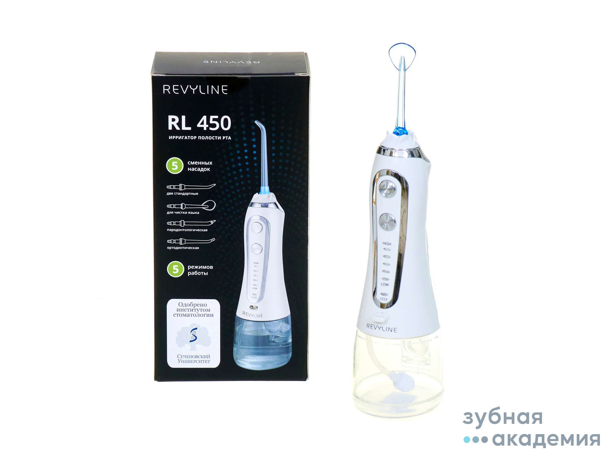 - Портативный ирригатор Revyline RL 450 создан специально для тех, кто ценит высокие технологии, отменное качество и современный дизайн. Пять уровней давления – от 130 до 760 кПа, пять насадок в базовой комплектации, большой резервуар на 240 мл, который удобно снимается и устанавливается, а также компактный размер, небольшой вес и изящный дизайн делают эту модель одной из самых популярных в линейке портативных ирригаторов. Отличный трэвел-вариант для путешественников: в комплект входит удобная и прочная дорожная сумка. Ирригатор прекрасно подходит людям, которые носят различные ортодонтические конструкции.
