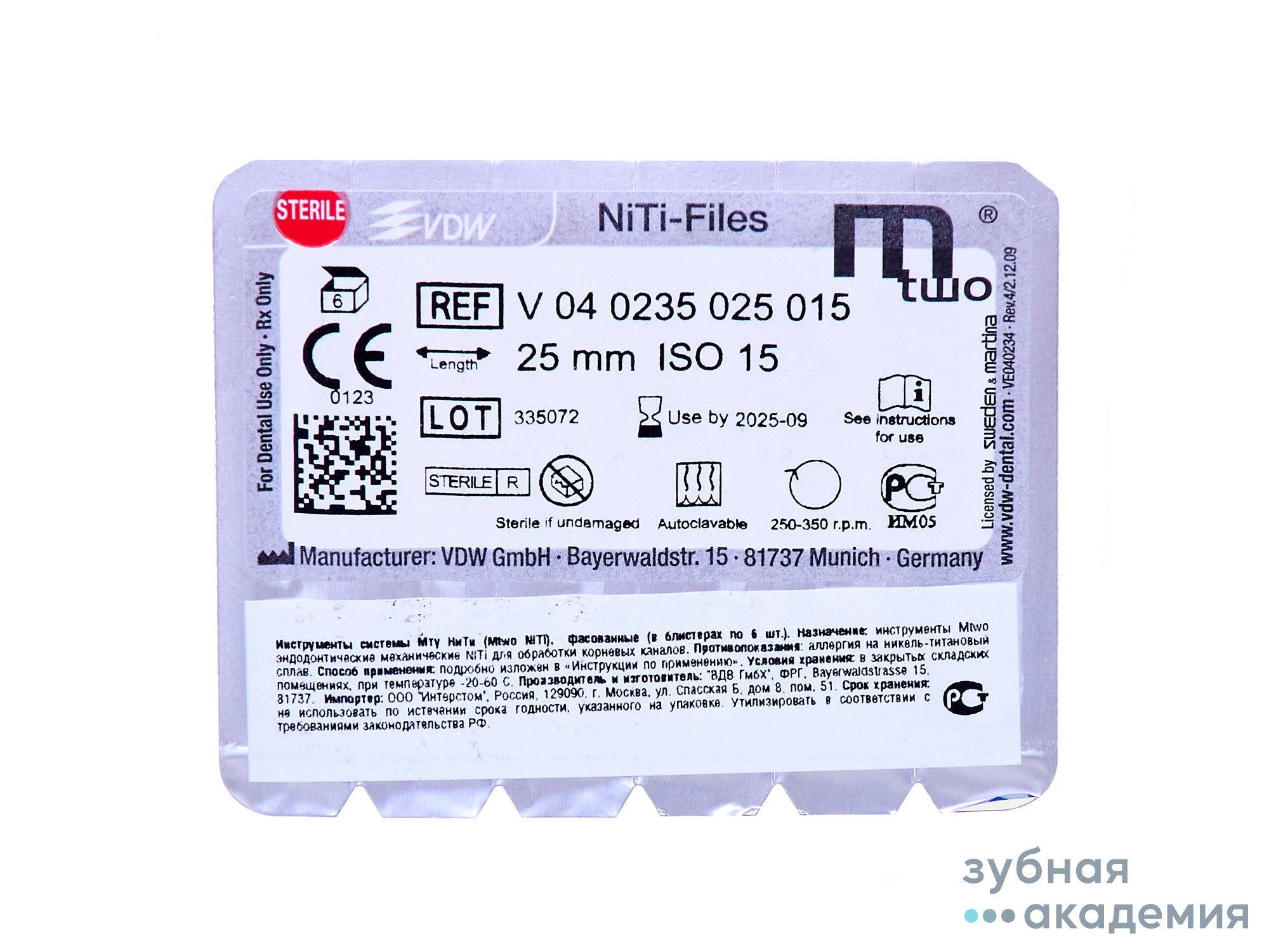 - Mtwo files Instruments изготавливаются из прочного материала – нержавеющей стали (никель-титан), инструменты отличается прочностью, дизайном и конструкцией, стерильные. Механические (роторные) эндодонтические инструменты, предназначенные для эндодонтического лечения осложненного кариеса: • для обеспечения корневому каналу оптимальных для ирригации и последующего пломбирования размера и формы; • для механической обработки корневого канала: прохождения корневого канала на всю рабочую длину, расширение просвета корневого канала и выравнивание его стенок комбинацией поступательных «клюющих» и круговых чистящих «опиливающих» движений с преобладанием последних. Особые свойства изделия: Mtwo files – состоит из хвостовика с помощью которого инструмент фиксируется в угловом наконечнике, металлического стержня с рабочей частью (участок стержня предназначенный для выполнения эндодонтических манипуляций) и силиконового стоппера.