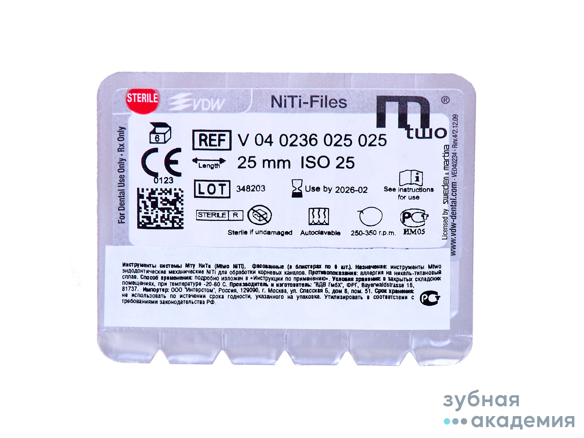 - Mtwo files Instruments изготавливаются из прочного материала – нержавеющей стали (никель-титан), инструменты отличается прочностью, дизайном и конструкцией, стерильные. Механические (роторные) эндодонтические инструменты, предназначенные для эндодонтического лечения осложненного кариеса: • для обеспечения корневому каналу оптимальных для ирригации и последующего пломбирования размера и формы; • для механической обработки корневого канала: прохождения корневого канала на всю рабочую длину, расширение просвета корневого канала и выравнивание его стенок комбинацией поступательных «клюющих» и круговых чистящих «опиливающих» движений с преобладанием последних. Особые свойства изделия: Mtwo files – состоит из хвостовика с помощью которого инструмент фиксируется в угловом наконечнике, металлического стержня с рабочей частью (участок стержня предназначенный для выполнения эндодонтических манипуляций) и силиконового стоппера.