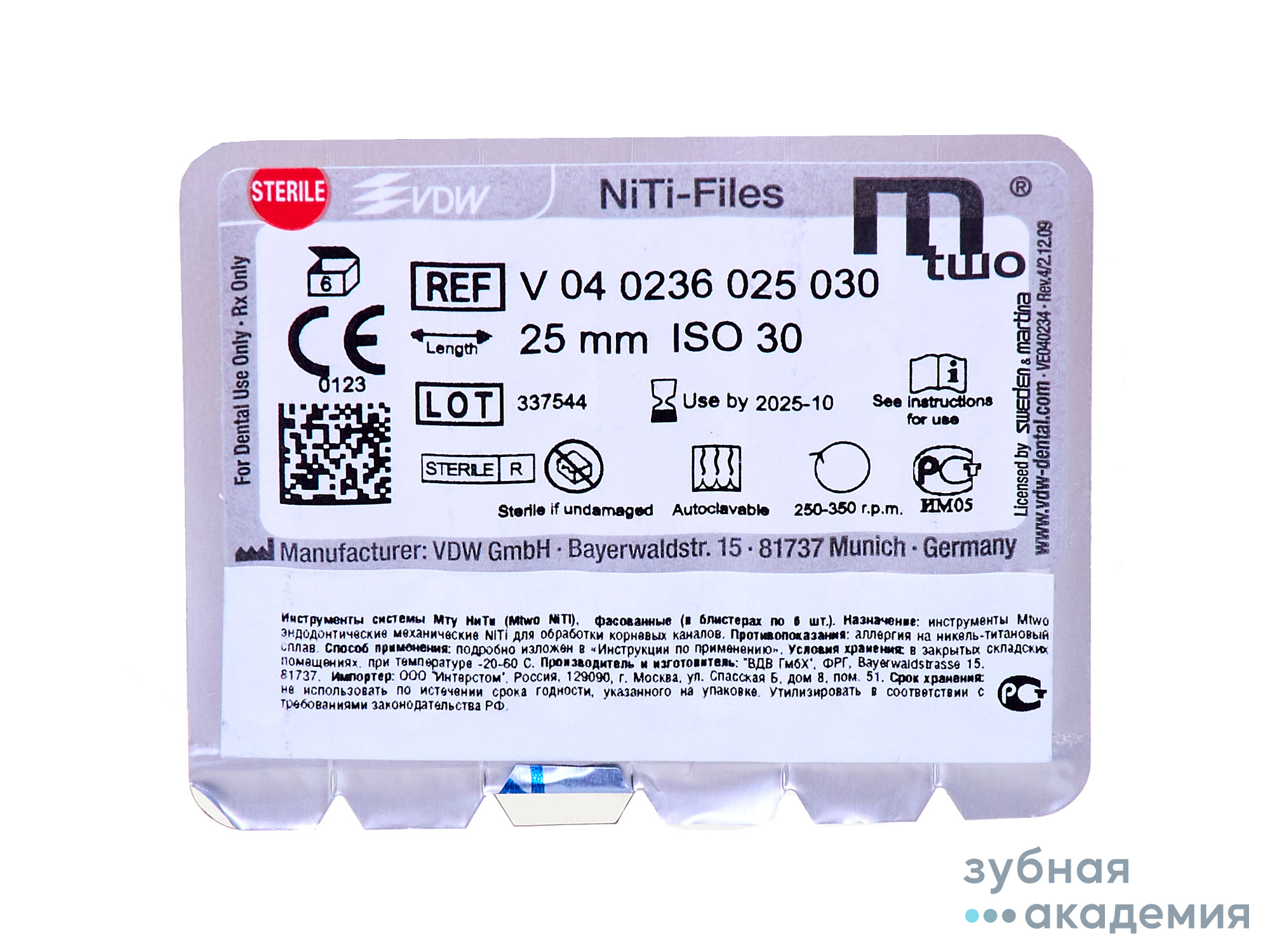 - Mtwo files Instruments изготавливаются из прочного материала – нержавеющей стали (никель-титан), инструменты отличается прочностью, дизайном и конструкцией, стерильные. Механические (роторные) эндодонтические инструменты, предназначенные для эндодонтического лечения осложненного кариеса: • для обеспечения корневому каналу оптимальных для ирригации и последующего пломбирования размера и формы; • для механической обработки корневого канала: прохождения корневого канала на всю рабочую длину, расширение просвета корневого канала и выравнивание его стенок комбинацией поступательных «клюющих» и круговых чистящих «опиливающих» движений с преобладанием последних. Особые свойства изделия: Mtwo files – состоит из хвостовика с помощью которого инструмент фиксируется в угловом наконечнике, металлического стержня с рабочей частью (участок стержня предназначенный для выполнения эндодонтических манипуляций) и силиконового стоппера.