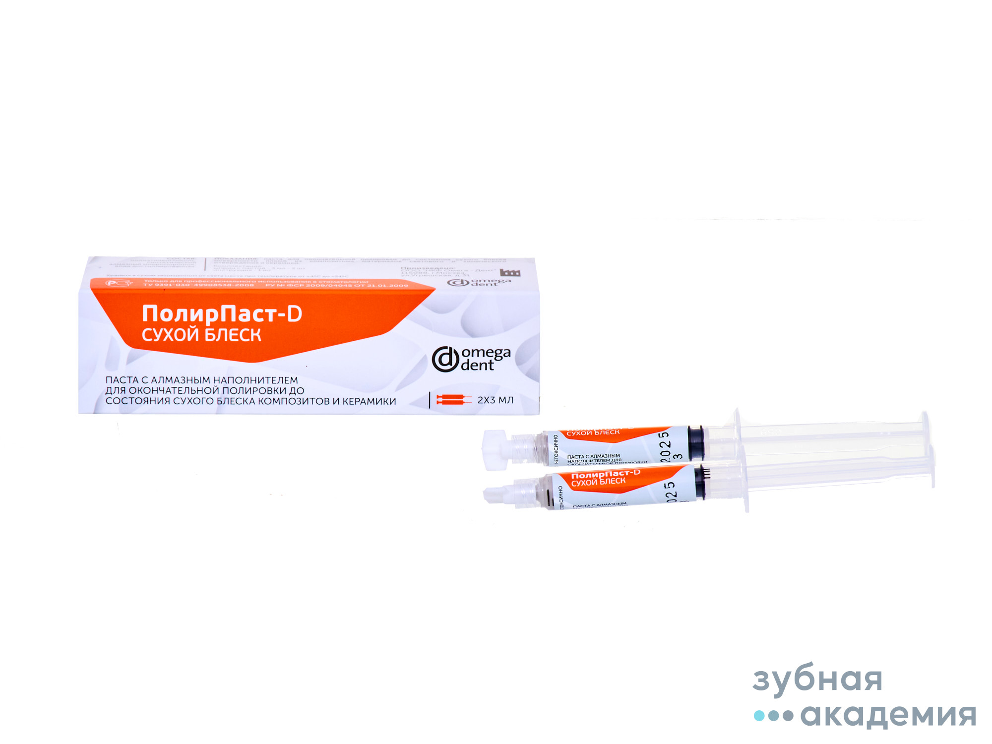 - ПОКАЗАНИЯ К ПРИМЕНЕНИЮ Паста используется при окончательной шлифовке и полировке до сухого блеска поверхности пломб, выполненных из композитных материалов светового и химического отверждения. Принцип действия "ПОЛИРПАСТ-D Сухой Блеск" основан на специфических абразивных свойствах мелкодисперсного алмазного порошка. Благодаря этим свойствам алмазный абразив производит окончательную полировку до состояния сухого блеска сформированной пломбы из композитных материалов.