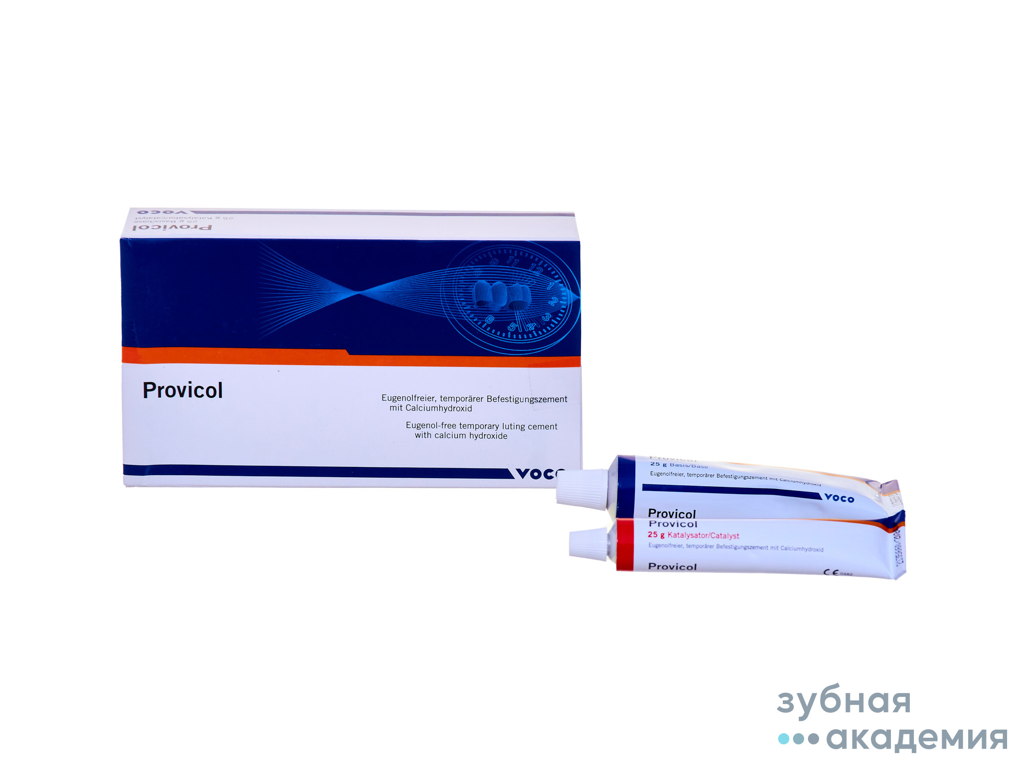 Не содержащий эвгенола цемент с гидроокисью кальция, который не влияет на затвердевание пломбировочного и фиксирующего материала на композитной основе. В случае проявления аллергии на эвгенол применяется Провикол. Провикол содержит гидроокись кальция для поддержания жизненной силы зубов. ПОКАЗАНИЯ К ПРИМЕНЕНИЮ: • Временная фиксация вкладок и накладок, коронок, частичных коронок, мостов, аттачменов и штифтов. • Временное пломбирование небольших одноповерхностных полостей. ПРЕИМУЩЕСТВА: • Не содержит эвгенол, следовательно не вызывает аллергии • Полуэластичные свойства для надежной временной фиксации • Кальция гидроксид: способствует образованию вторичного дентина действует бактериостатически. • Идеален перед адгезивной фиксацией композитными цементами, поскольку отсутствует какое-либо ингибирование реакции полимеризации пломбировочных или фиксирующих материалов на основе композитных смол. КОМПЛЕКТАЦИЯ: 2 тубы по 25 г. (основа / катализатор).