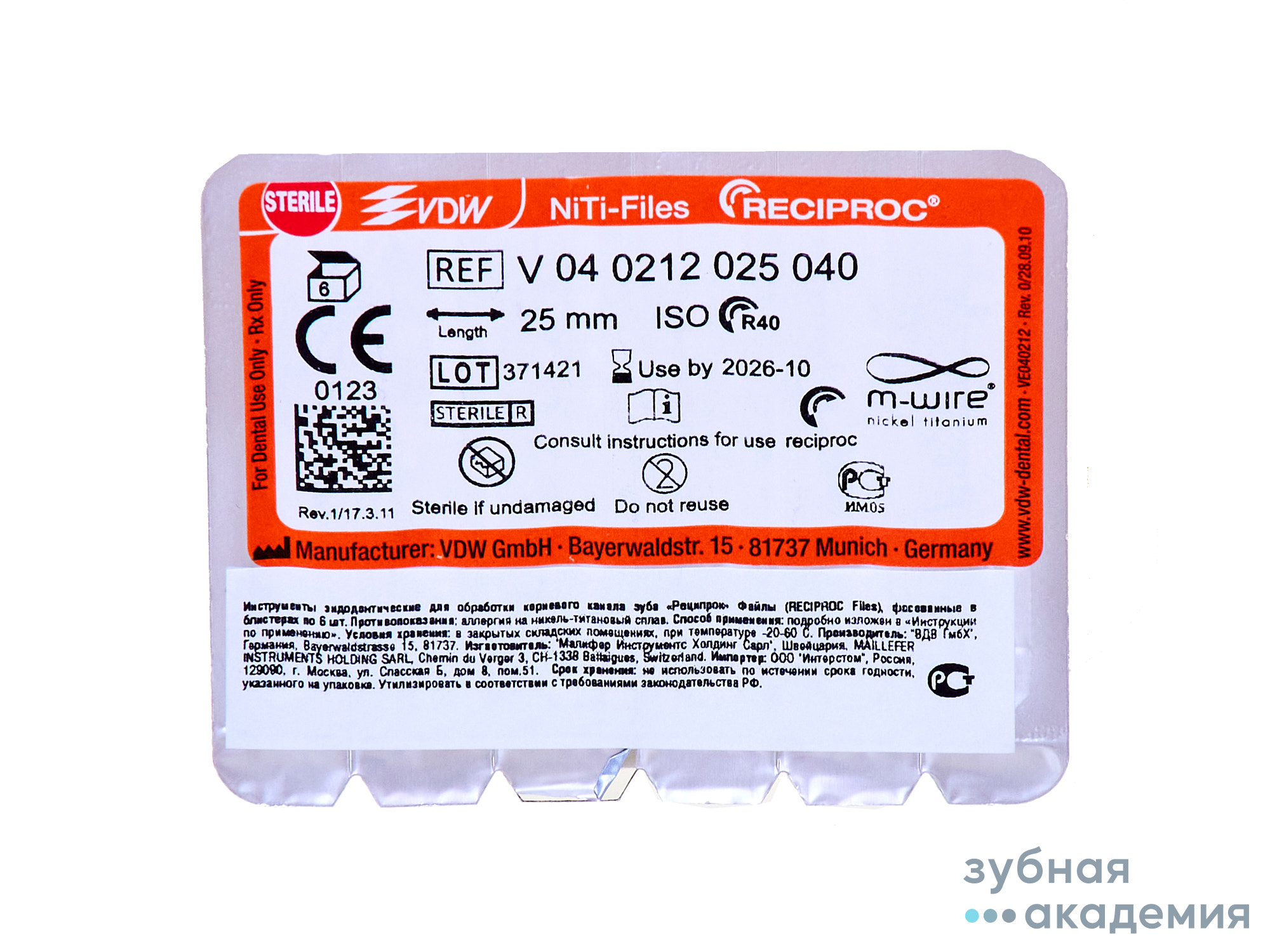 Реципрок файлы (RECIPROC) стерильные механические эндодонтические инструменты, предназначенные для эндодонтического лечения осложненного кариеса, для обеспечения корневому каналу оптимальных для ирригации последующего пломбирования размера и формы, всего лишь одним инструментом без предварительного формирования ковровой дорожки. Нерабочая часть стержня инструмента градуирована рентгеноконтрастными насечками на расстоянии 18, 19, 20, 22мм от верхушки для удобства определения его длины на рентгенограмме. Инструмент изготавливается из Никель - титанового сплава M-Wire, при помощи особого процесса термообработки. Инструмент имеет неагрессивную (неострую) верхушку. Важной конструктивной особенностью инструмента является укороченный хвостовик, который обеспечивает более удобный доступ к молярам.