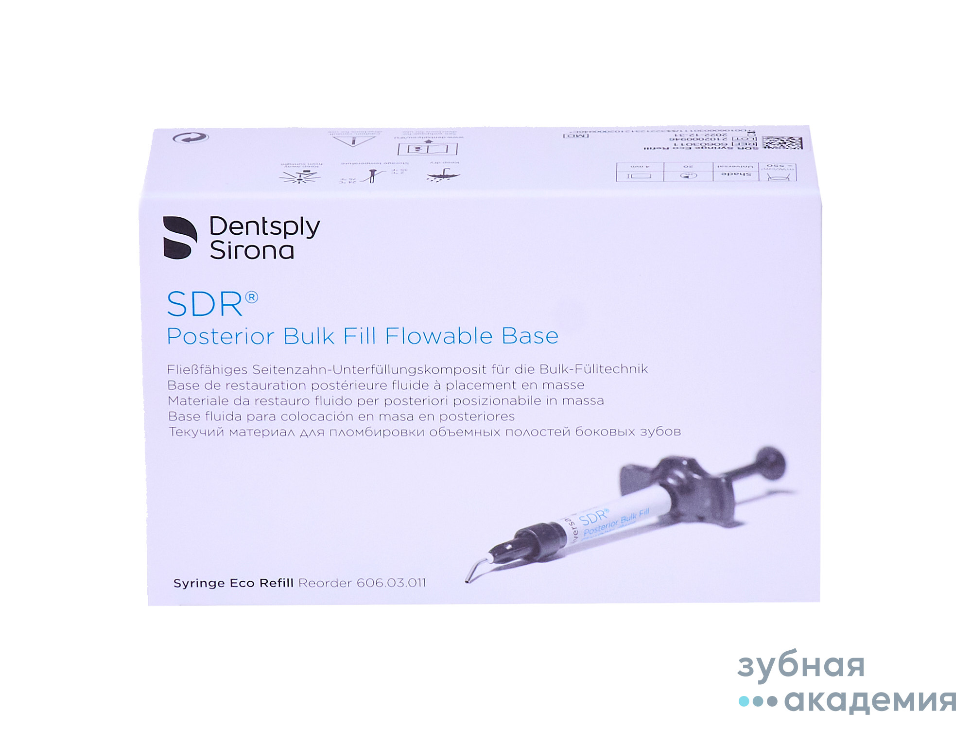 SDR является однокомпонентным, фторсодержащим, светоотверждаемым, рентгеноконтрастным композитным реставрационным материалом. Он предназначен для использования в качестве прокладочного материала в полостях I и II класса. Он также может применяться как самостоятельный пломбировочный материал в областях, не подверженных жевательной нагрузке.