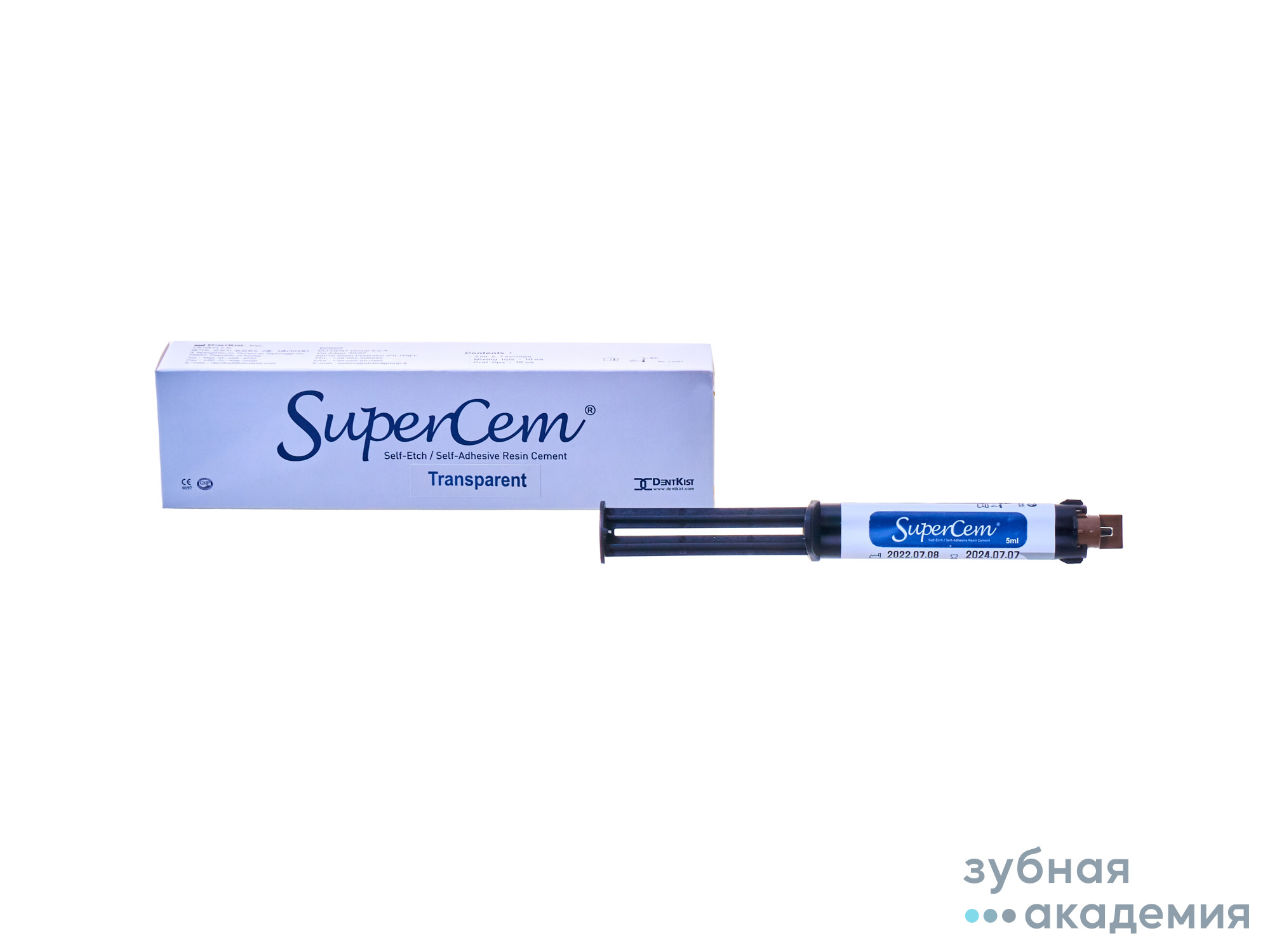 - SuperCem от производителя DentKist – материал полимерный восстановительный тип 2, класс 3по ISO 4049 - композитный цемент с двойным отверждением: самоотверждение и отверждение под воздействием внешних источников энергии, самопротравливающий Страна изготовитель: Южная Корея. Компоненты материала SuperCem в виде пасты заправлены в черный двойной шприц (картридж) с колпачком. Для применения по показаниям компоненты материала механически смешивают. В одном шприце – основа, в другом - катализатор. Картридж имеет два плунжера (поршня). В комплекте с картриджем для работы с материалом поставляются смесительные наконечники и канюли. Механическое смешивание компонентов материала обеспечивается путем их выдавливания плунжерами (поршнями) из картриджа через смесительные наконечники. Материал имеет оттенки: белый, универсальный, прозрачный.