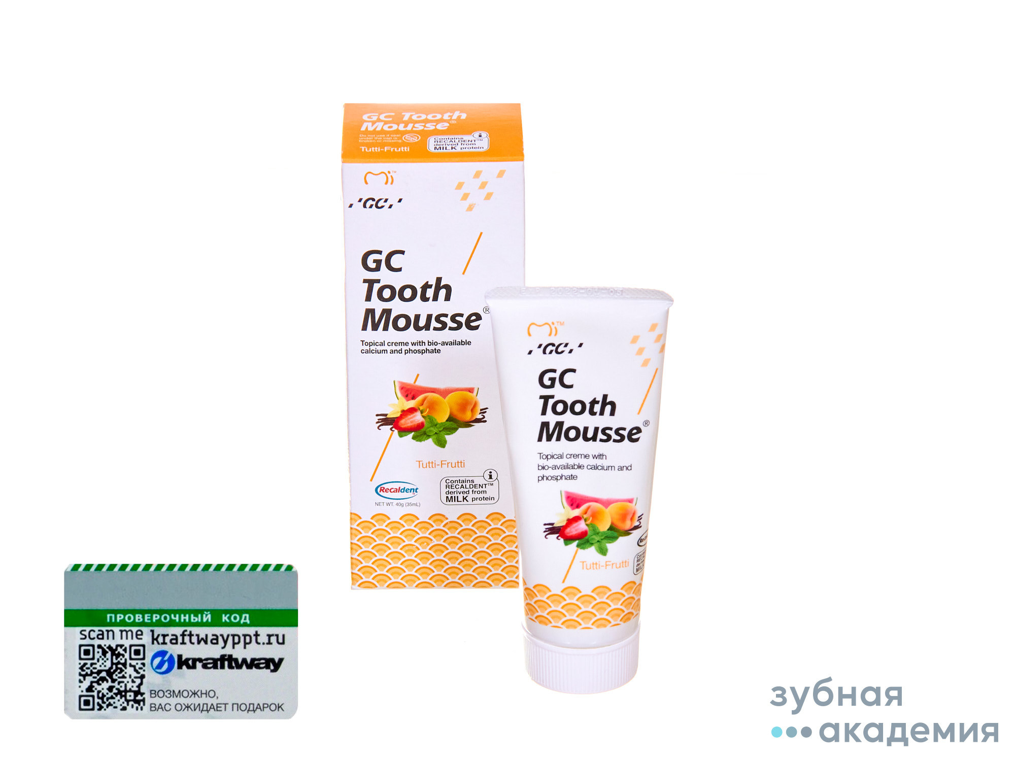 - GC Tooth Mousse – это крем на водной основе, содержащий RECALDENT TM (СРР-АСР: Казеин Фосфопептид - Аморфный Кальций Фосфат). В полости рта молекулы СРР-АСР связываются с биопленкой, зубным налетом, кристаллами гидроксиапатита эмали зубов и оседают на мягких тканях, локализуя биодоступные кальций и фосфат. ПРИМЕЧАНИЕ: Слюноотделение усиливает эффективность действия СРР-АСР, а вкусовые добавки, в свою очередь, усиливают слюноотделение. Чем дольше комплекс СРР-АСР и слюна находятся в полости рта, тем эффективнее результат. Стоматологический крем, содержащий биодоступные кальций и фосфат. • Обеспечивает дополнительную защиту зубов. • Помогает нейтрализовать излишнюю кислотность, вызванную деятельностью кислотопродуцирующих бактерий зубного налета. • Помогает нейтрализовать излишнюю кислотность, вызванную воздействием иных внутренних и внешних источников кислотности. ПРОТИВОПОКАЗАНИЯ: RECALDENT TM (CPP-ACP) вырабатывается из протеинов молока.